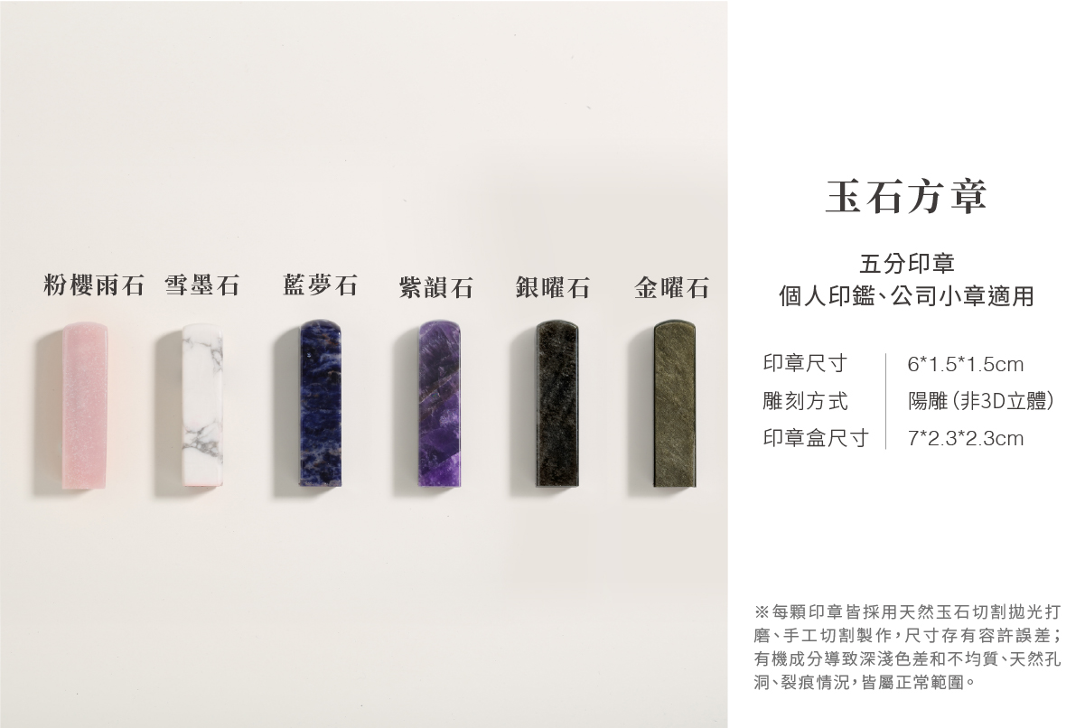 • 每顆印章製作採用天然玉石,依取用部位不同,會有色澤深淺及紋理落差,此為正常情形;照片顏色為大略參考,以收到實品為主