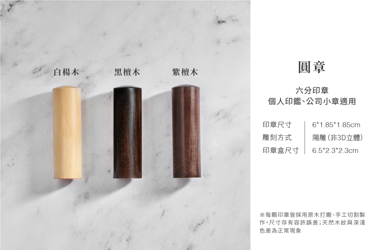 • 每顆印章製作採用天然木材,依取用部位不同,會有色澤深淺及紋理落差,此為正常情形;照片顏色為大略參考,以收到實品為主